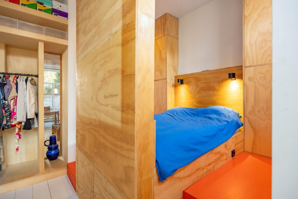 Bij binnenkomst sta je direct in een ruime hal die toegang biedt tot de spectaculaire slaapkamer van ca. 19m². Dit is geen doorsnee slaapkamer; hier is elke centimeter benut. Het tweepersoonsbed is slim geplaatst op een verhoogd plateau met daaronder een zee aan opbergruimte. Aan weerszijden van de kamer vind je maatwerkkasten van vloer tot plafond en een open kast voor hangkleding. Praktisch en stijlvol tegelijk.