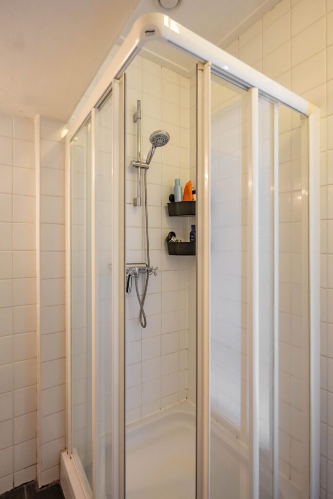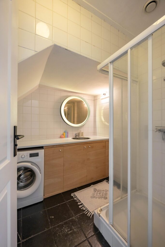Via de hal bereik je ook de badkamer. Hier tref je een breed wastafelmeubel met opbergruimte, een ruime douchecabine en de aansluiting voor de wasmachine. Daarnaast is er een separaat, modern hangtoilet.