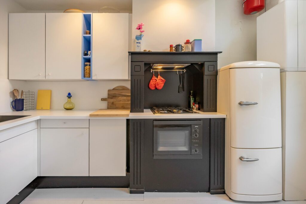 De moderne hoekkeuken uit 2023 past naadloos in het geheel. Met een gaskookplaat en afzuiging verwerkt in de originele schouw, een combi-oven en volop kastruimte is dit een droom voor kookliefhebbers. De koelkast is los geplaatst.